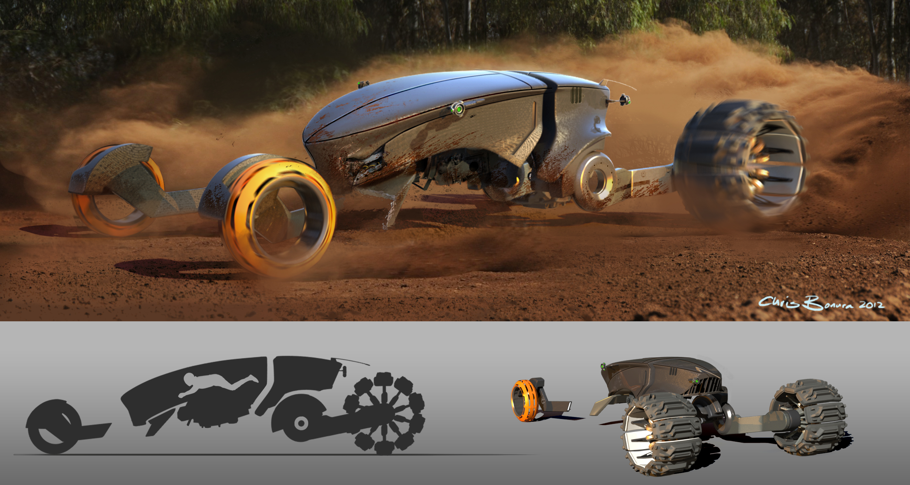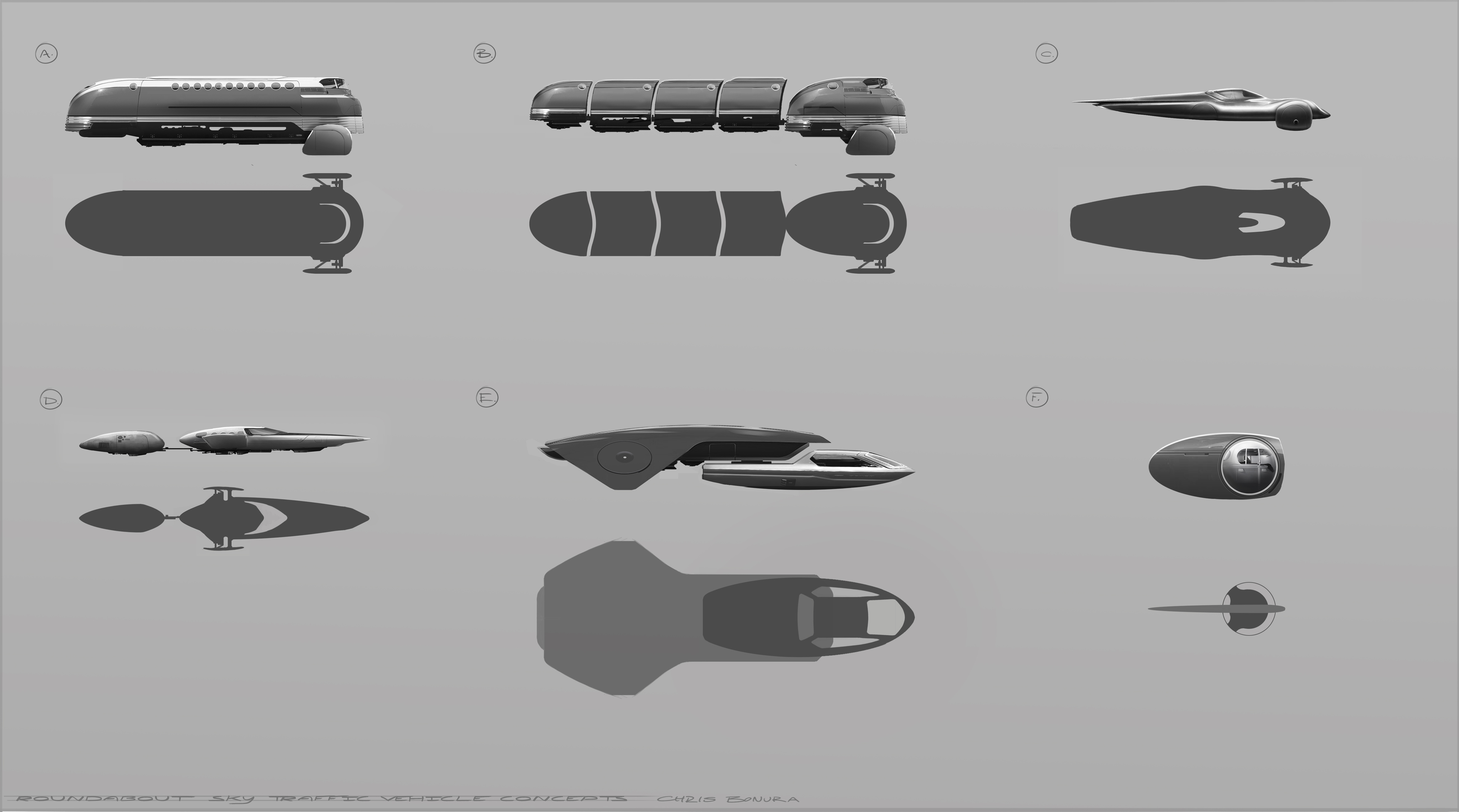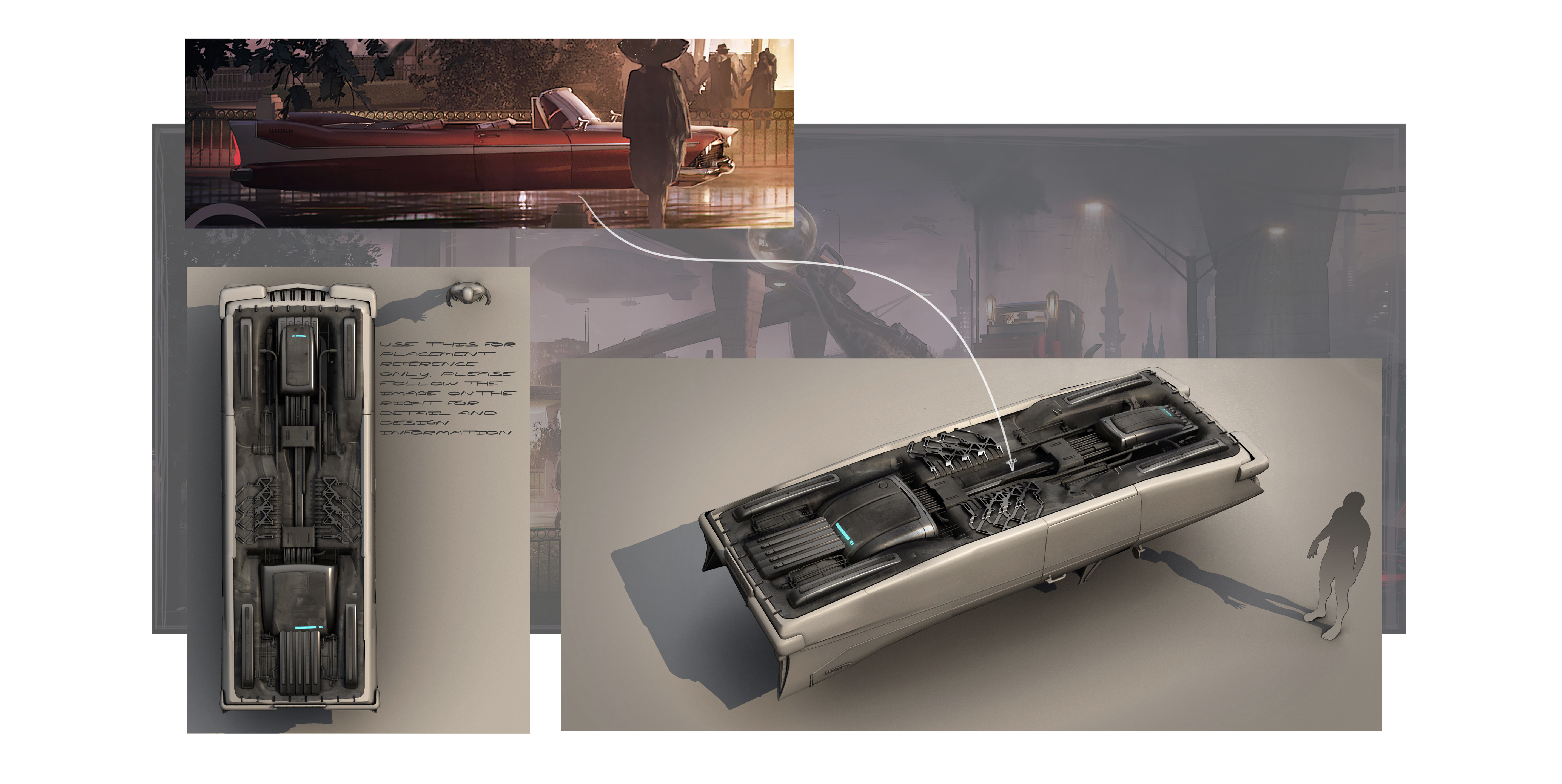 This is a future retro vehicle design for a VR experience. On this I did a more detailed concept of the floating chassis, as we see it fly over head and it needed to be spelled out. It was a quicker design as it's more of a background vehicle and not a hero vehicle. This is from an illustration which I pulled out to establish a clearer design for the modelers.